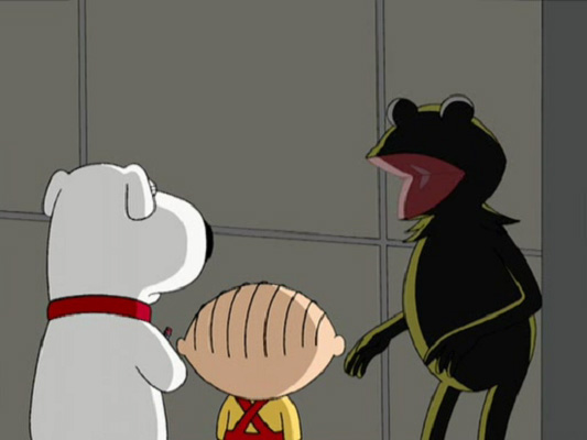 "Stewie Loves Lois" Peter is under the assumption that he has been sexually harassed by Dr. Hartman – the threat in question being a required prostate exam for prevention of cancer – and decides to sue. "Too many people get away with injustice, like the folks you meet in those Louisiana swamps." In the following vignette, alluding to the first scene in The Muppet Movie – in a rather discriminatory manner – Kermit sits on a log in said swamp, playing his banjo when a lost tourist asks him for directions to town. Kermit answers, "It's back the way you came," at which point he takes out his shotgun. |