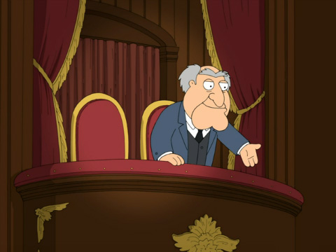 "Grumpy Old Man" Statler and Waldorf are in a nursing home that is being toured by Carter Pewterschmidt and the Griffins. Waldorf complains of always being constipated due to a hand up his posterior. |