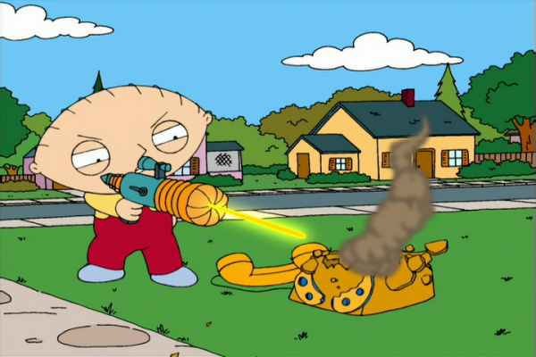 When Ernie asks Stewie if he can count to three, Stewie answers by shooting the phone with his ray gun three times, counting while he does so, until it catches flames. "Can I count to three? For god's sake, I'm already shooting at a fifth grade level!" |