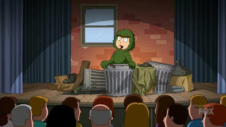 "The D in Apartment 23" Stewie decides to go along to the Quahog University library to avoid having to do sad, one-woman shows like Meg in his future, leading to a cutaway gag of Meg singing "I Love Trash" while dressed as Oscar the Grouch. When Peter questions whose genes she received, Lois points out that he is wearing a garbage bag as a cape. They are both quieted by Oscar who notes that Meg is doing an excellent job in the role. |