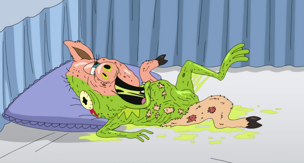 "In Harmony's Way" At the start, the family is watching TV, and the announcer says, "We now return to Muppet Babies." On the screen, the adult Kermit the Frog and Miss Piggy are looking into a crib, and Kermit notices that "Kermie Junior" isn't doing very well. It then pans down to a very ugly half-frog/half-pig mutant, complaining that he is in constant pain and just wants to be killed. |