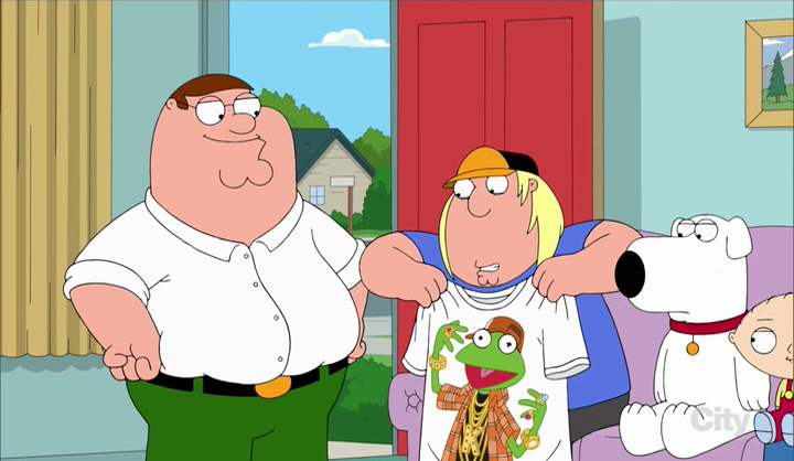 "Inside Family Guy" During a "behind-the-scenes" tour hosted by James Woods of the production offices of Family Guy, props from past episodes, including a cartoon version of Muppet Lois from "Foreign Affairs," can be seen. In the same episode, Peter gives Chris a t-shirt with "hip-hop Kermit" on it to celebrate returning to the show. |
