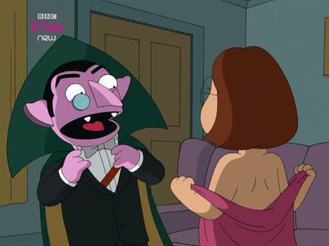 | Family Guy Viewer Mail #1 In the second segment, "Super Griffins," Peter and Brian are watching a clip of Sesame Street on TV, involving The Count counting bats in his castle. Peter questions to Brian about The Count's (obvious) physical appearance, inquiring if there had ever been an episode [of Sesame Street] in which The Count "kills somebody and sucks on their blood for sustenance." Brian points out that no such episode exists. | |