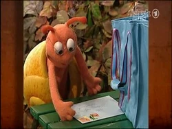 Finchen returns to the stamp with some things that Nils has packed. The stamp then begins to sing about making a journey. After the song the stamp wonders where he is going and Finchen shows him the address on the letter. Finchen looks away for a short moment as the stamp has returned to the letter, and next to the original stamp there's a new stamp with the items that they have packed for the journey. Finchen posts the letter and Nils comes by to ask if she posted the letter. Finchen tells him that it's underway and that it also took the vegetables with it. Nils gets a little confused and Finchen laughs.