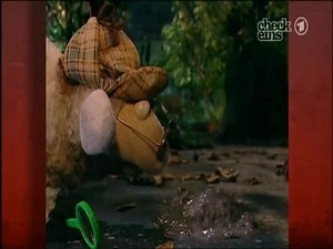 Rumpel is fetching mud for his mud bath, but his bucket is filled with so much mud that he spills some as he goes back and forth. Meanwhile, Pferd discovers a funny looking mud stain and Detective Wolle immediately appears to investigate. Wolle takes a closer look at the mud stain. He concludes that it must have been brought to where it is since it doesn't have any legs. Pferd finds 2 more mud stains on the ground. Wolle concludes that it's a mud track and if they follow it, they will discover who made them.