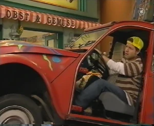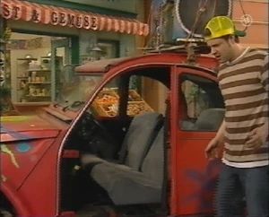 Scene | Nils can't wait to test the car; however, he discovers some flaws. The door comes off as he opens it, but it doesn't worry him much because there's a door on the other side. However, that also falls off as he gets into the car. |