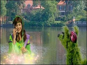 Muppets | Wanda Cousteau meets Elmo and tries to ask him questions, but he quickly asks counter questions. Telly Monster arrives and at first he seems scared of the fish with the bowl on its head, but decides that the others have to meet this fish. Elmo agrees, and they go to fetch the others. (from episode 3128 of Sesame Street) (EKA: Folge 2105) |