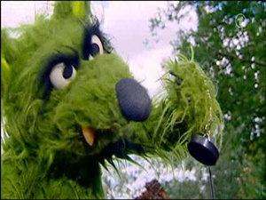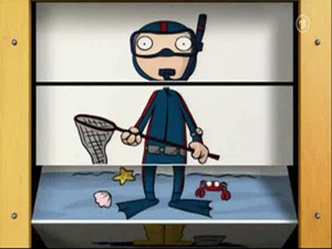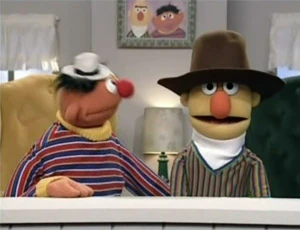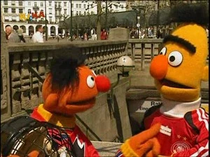Bert, in soccer gear, asks Ernie why he is wearing his ice hockey outfit, since they are about to be going to a soccer match. Ernie replies that there can only be one answer to that: they will now be going to an ice hockey match, and much to Bert's dismay, he'll have to change clothes. (First: Folge 2375)