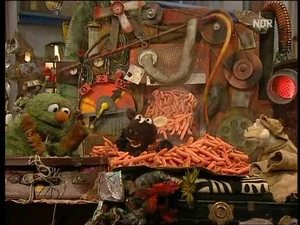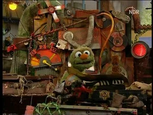 Rumpel is putting the final touches on the new machine that he has built after the blueprint his great-great-grandfather, Grouch-onardo, created. Pferd comes by and asks about the machine, to which Rumpel tells him that it's a doubling machine and that he wants to be left in peace so he can test the machine. Pferd decides to hide nearby. Rumpel puts a screw into the machine and sets it to "two copies" and out of the machine come two screws. Rumpel is delighted that now he can have twice as much junk. He leaves Karl Heinz at the funnel for the machine, then goes to fetch more junk.