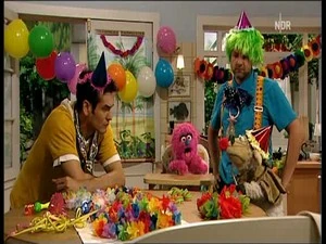 He re-thinks and comes up with a new conclusion. The room is not kid friendly; it's way too dull. Nils and Mehmet start to redecorate the room. Wolle tells Lena to take a closer look at the room, and afterwards she starts to cry again. Wolle then realizes that it's correct that the room is decorated, but the three of them also look dull so they need to change their clothes. Mehmet, Nils and Wolle pop up next to Lena wearing party hats and start to cheer and laugh. Lena starts to laugh, but shortly afterwards she resumes crying. Nils and Mehmet give up, but Wolle has a new idea. He is sure that Lena doesn't want to be inside; she wants to be out in the fresh air.