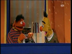 Scene | Ernie tells Bert that Manni has repaired the radio. But before Bert can stop Ernie from turning it on, he gets hit by confetti coming up from the tape deck. |