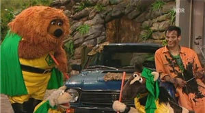 Scene | They encounter a blue spider in its web. They are convinced that the spider is helpless stuck in the web and that it needs some help to get down, so Super Samson tears down the web to free the poor spider. They then notice a man who appeares to be stuck under a car. Super Pferd rescues the man, who turns out to be Mehmet, and Super Samson pulls him to safety away from the car. |