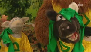 Scene | The first thing a super hero must have is the right costume, and Super Samson just happens to have a few spare suits. The next thing they need are cool superhero names. Pferd thinks the name "Phantom Pferd" sounds good, and Wolle likes the name "Wonder Wolle". However, they end up using the names Samson suggests: "Super Pferd" and "Super Wolle". Samson tells them that they could call themselves "The Fantastic Three", and they go off to find someone to rescue. |