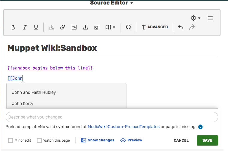 - Here's another one, not yet reported. While editing in source mode, automatic link suggest only works some of the time. In cases when it's working upon first editing the page, it often stops working if you click SHOW PREVIEW. This seems to be related to javascript sometimes not working until the page is refreshed (noticeable with some of the w:c:dev scripts we're using). —Scott