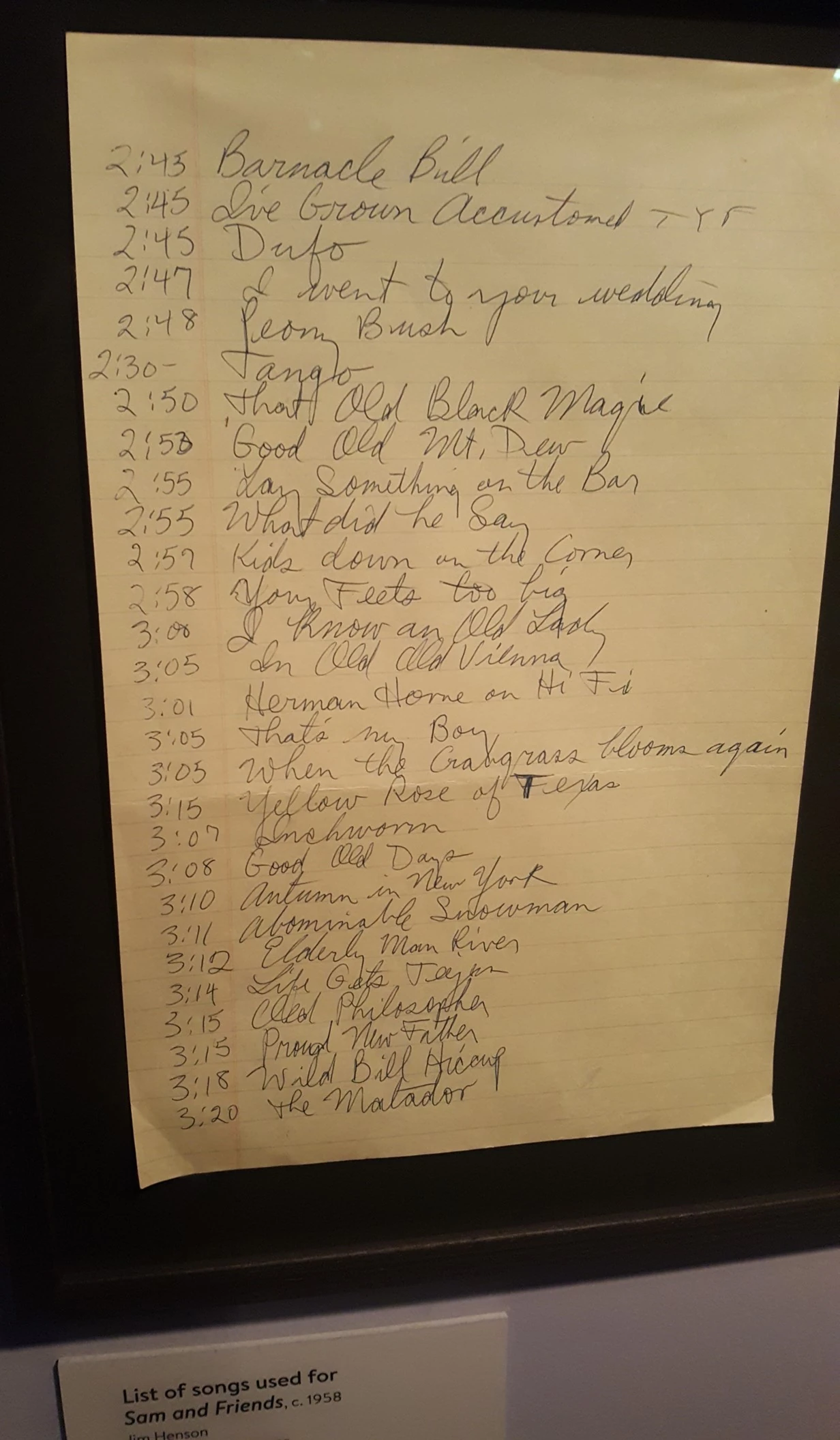 - "Dufo" is a Wally Cox recording, aka "What a Crazy Guy." It's on YouTube, and the time matches. "What Did He Say" is also known as "The Mumble Song," but I've found at least two different recordings of it, so I'm not sure which would've been used for Sam & Friends. -- Tony (talk) 03:29, 13 March 2022 (UTC)