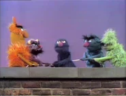 Grover demonstrates cooperation with monsters who are playing tug-of-war.