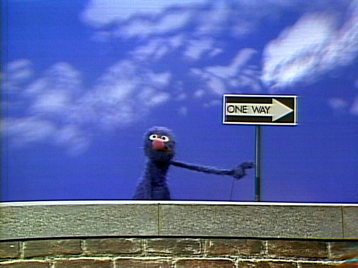 Grover talks about the sign "ONE WAY." Making appearances include Guy Smiley, Gladys the Cow, the Willy Muppet and various Anything Muppets.