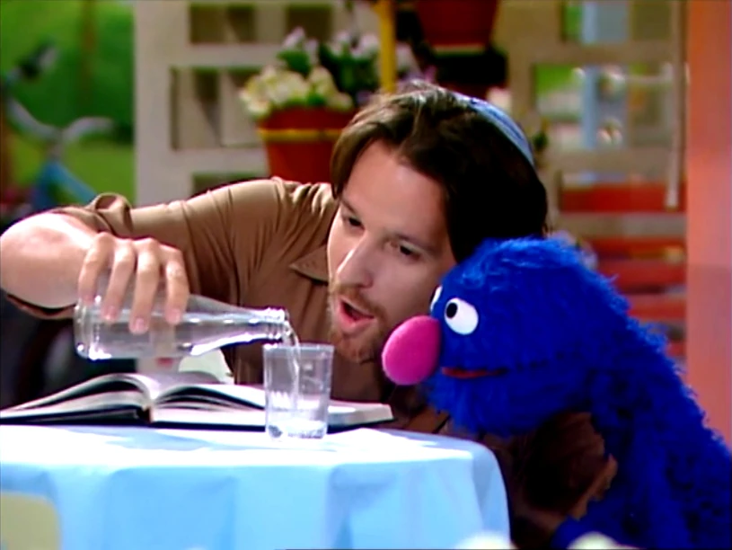 SCENE 2 cont'd | Grover shows off his skills to Kobi, who teaches him the Hebrew word for bottle, which was created based on the sound it makes when it's poured. He claims there are other words like that... |
