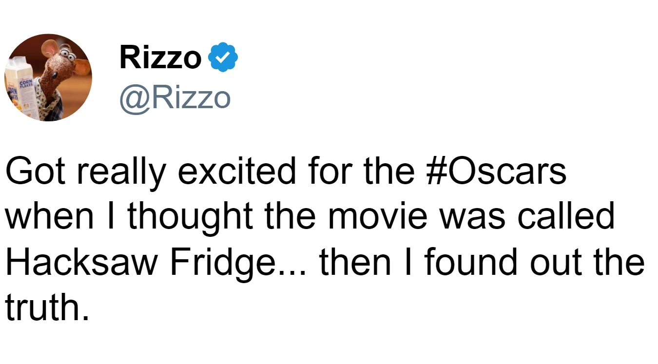 - Ahead of the 2017 Oscars ceremony, Rizzo the Rat tweeted, "Got really excited for the #Oscars when I thought the movie was called Hacksaw Fridge... then I found out the truth."[1]