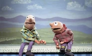 Hank and Frank were characters from Sam and Friends. They were abstract humanoid puppets with no hair and only eyes, a nose and a mouth. They took the roles of legendary news anchors Chet Huntley and David Brinkley in a spoof interview conducted by Kermit.