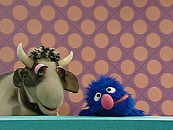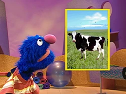 FRAME 3 cont'd | The world-famous cow from "Hey Diddle Diddle" arrives and clarifies that she's the only one of her kind who can jump. Grover pleads with the cow to teach him her ways, so she shows her jumping technique and busts through the ceiling of the studio (which Grover points out is rented). He calls for another break while they wait for the cow, who quickly lands on top of him, having not jumped high enough to make it to the moon. |