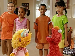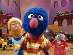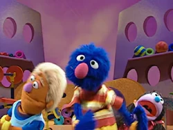 Elmo and Zoe watch and jump along to the Happy Healthy Monsters Network, hosted by Grover and his exercise assistants, Bobby and Cissy. The network airs Grover's exercise show "Fuzzy and Blue, and Healthy Too!" and segments promoting exercise and healthy eating habits. Guest stars include Fred Willard, Andy Richter, India.Arie, and Wyclef Jean.