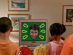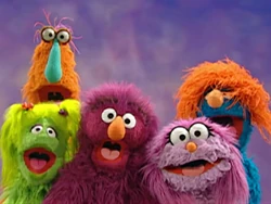 FRAME 1 | An announcer (Fred Willard) presents the Happy Healthy Monsters network. A chorus of AM Monsters (including Googel, Narf, and Phoebe with an altered design) sing a jingle about how they stay happy and healthy. The announcer teases the next program, Fuzzy and Blue and Healthy Too. Elmo is seen watching the network on a Nologo TV in a living room, and he calls in Zoe and some kids as the show begins. |