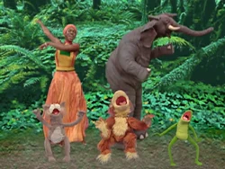 Muppets / Celebrity | India.Arie sings a jumping song and is joined by some wild animals; a rabbit (Barnhart), a frog (Kevin Clash), a monkey (David Rudman), and a jump-happy elephant. |