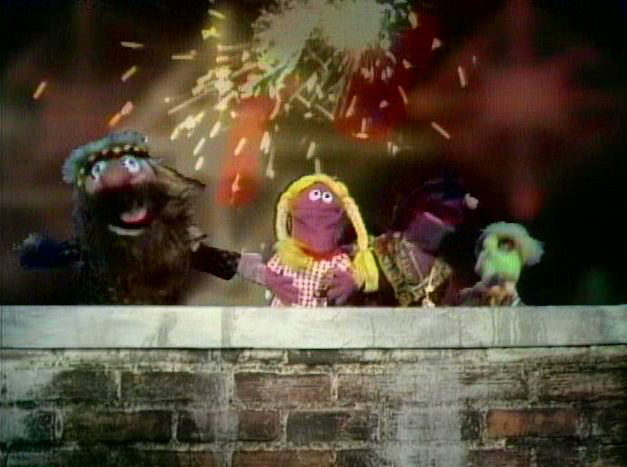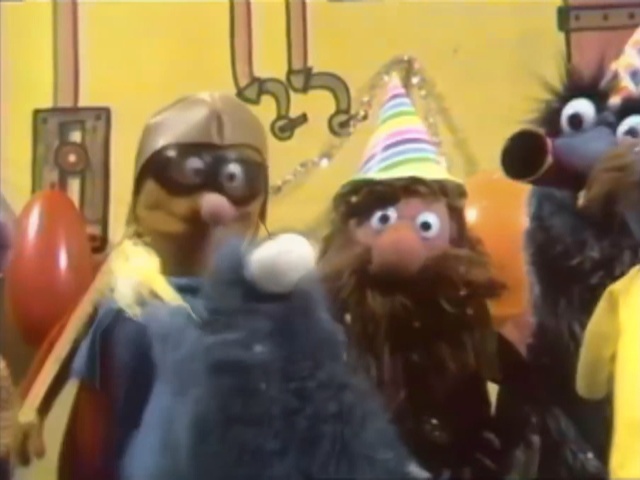 Bob dresses up three Anything Muppets (Fat Blue, Pumpkin, and Purple), who scoot off to their submarine and sing "Yellow Submarine," where they party with other Muppets (including the hippie, Beautiful Day Monster, and Cookie Monster).
