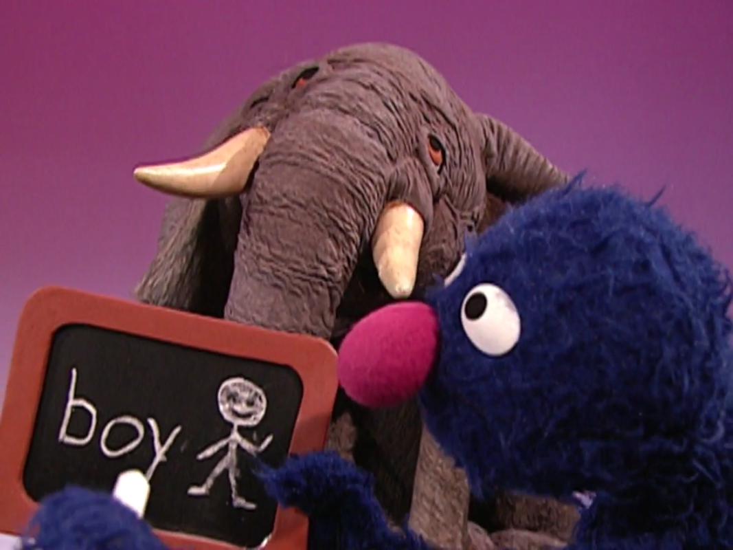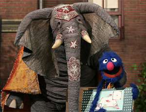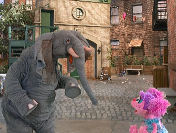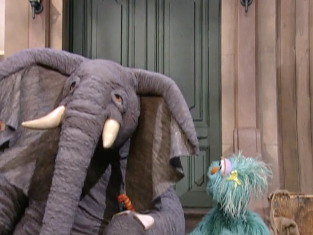 For years, the Elephant didn't have a specific role on the Street. He regularly appeared as a "spoiler" in various situations, coming through a scene and creating some kind of clumsy havoc. For example, in the punchline of the song "Mr. Between," he appears as "Mr. On Top Of" and crushes the singer. He also appears in Elmopalooza, willing to be a part of the show (even saying he'd work for peanuts). He changes into a curly blonde wig (spoofing Lord of the Dance) and shows off his dancing skills which shakes the theater.