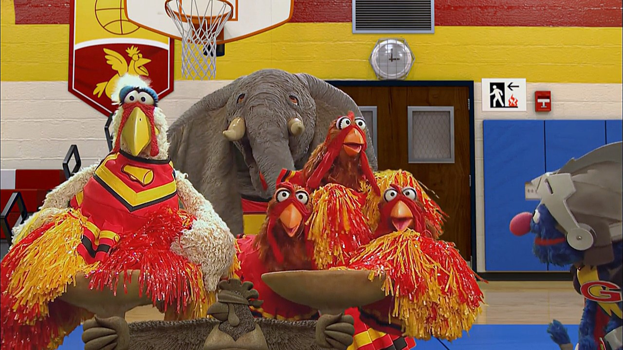 Super Grover helps a ground of cheerleading chickens (and elephant) balance for their performance. |