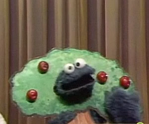 Cookie Monster as an apple tree | Sesame Street pageant | Cookie Monster wears a tree costume to represent "Fall" in the seasons pageant. |