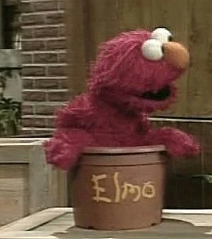 Elmo as a "furry red monster plant," | Episode 3905 | Elmo decides he wants to be a plant like Stinky, so he places himself inside a pot with his name on it. |