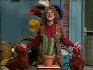 After a series of vignettes where Big Bird and Snuffy demonstrate opposites that can be done simultaneously, Ruthie follows with a performance of her own - by standing in front of a hatrack, in back of a cactus, between two bow tie-wearing chickens, with one foot up on a box and the other down on the ground... all at the very same time! She even manages to throw in a bit of yodeling for good measure as Big Bird, Snuffy, and several kids (including Lexine) marvel at her accomplishment.