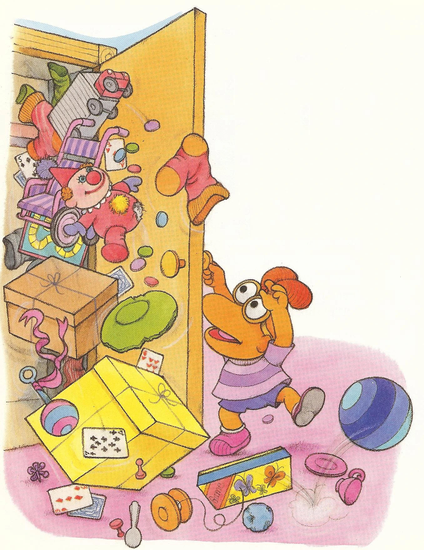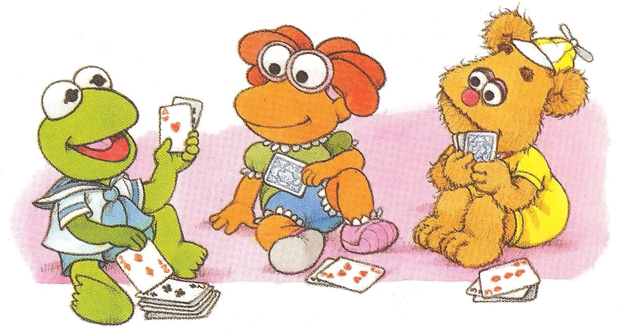 When they get through it all the babies realize that they have gotten rid of nothing, but Kermit has an idea to fix the situation. He uses Skeeter's old frisbee as a new wheel for Baby Piggy's doll buggy, and Baby Scooter uses his ball as a new noise maker for Animal's rattle. Soon they've used all the old toys in the Nursery to fix up other old toys, and have cleaned out the closet in the process. |