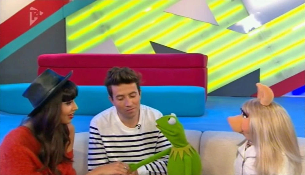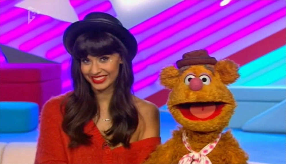 As host of Channel 4's T4 programming block, she appeared with the Muppets during the 2012 T4 Muppet Takeover. Her primary interaction with the Muppets was in an interview with Kermit the Frog and Miss Piggy who were appearing to promote the UK release of The Muppets. Kermit flirted with Jamil, prompting an invite from Miss Piggy to leave the set where she administered a karate chop to the host off-camera. Jamil also had a brief correspondence with Fozzie Bear where the two exchanged jokes (Fozzie commended Jamil on her use of his Wocka Wocka catchphrase) and with Animal who accused her of destroying a teddy bear in the green room (before Animal himself coughed up the bear's stuffing).