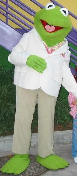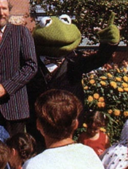 Kermit appears as a park walk around character at Walt Disney World. The silent full body character shakes hands, poses for pictures and signs autographs. This version of the walk-around costume was made for the Disney's Stars and Motor Cars Parade, which debuted in 2002 as part of Disney's 100 Years of Magic celebration. |
