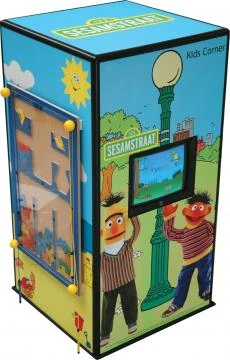 Jorakids manufactured Sesamstraat kids cubes for businesses and exhibitions (KC-J002). It is a sort of television stand with 2 educational wooden games. You can choose between a build in TV/DVD player or a touchscreen with 17 inch monitor. Measurement is: 140h x 70b x 70d [cm].