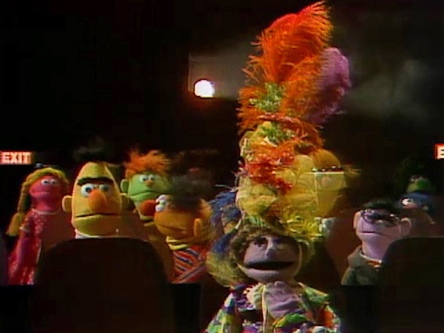 A lady with a tall hat appeared in an Ernie and Bert sketch at the movies. She sits in front of Ernie, and her hat blocks his view. He tries various attempts to watch the movie anyway, such as trying to switch seats with Bert, then trying to sit on his lap. Bert tells him to simply ask the lady to remove her hat. Ernie does so, and the lady graciously removes her hat and places it on the empty seat next to her, now blocking Bert's view, much to his dismay.
