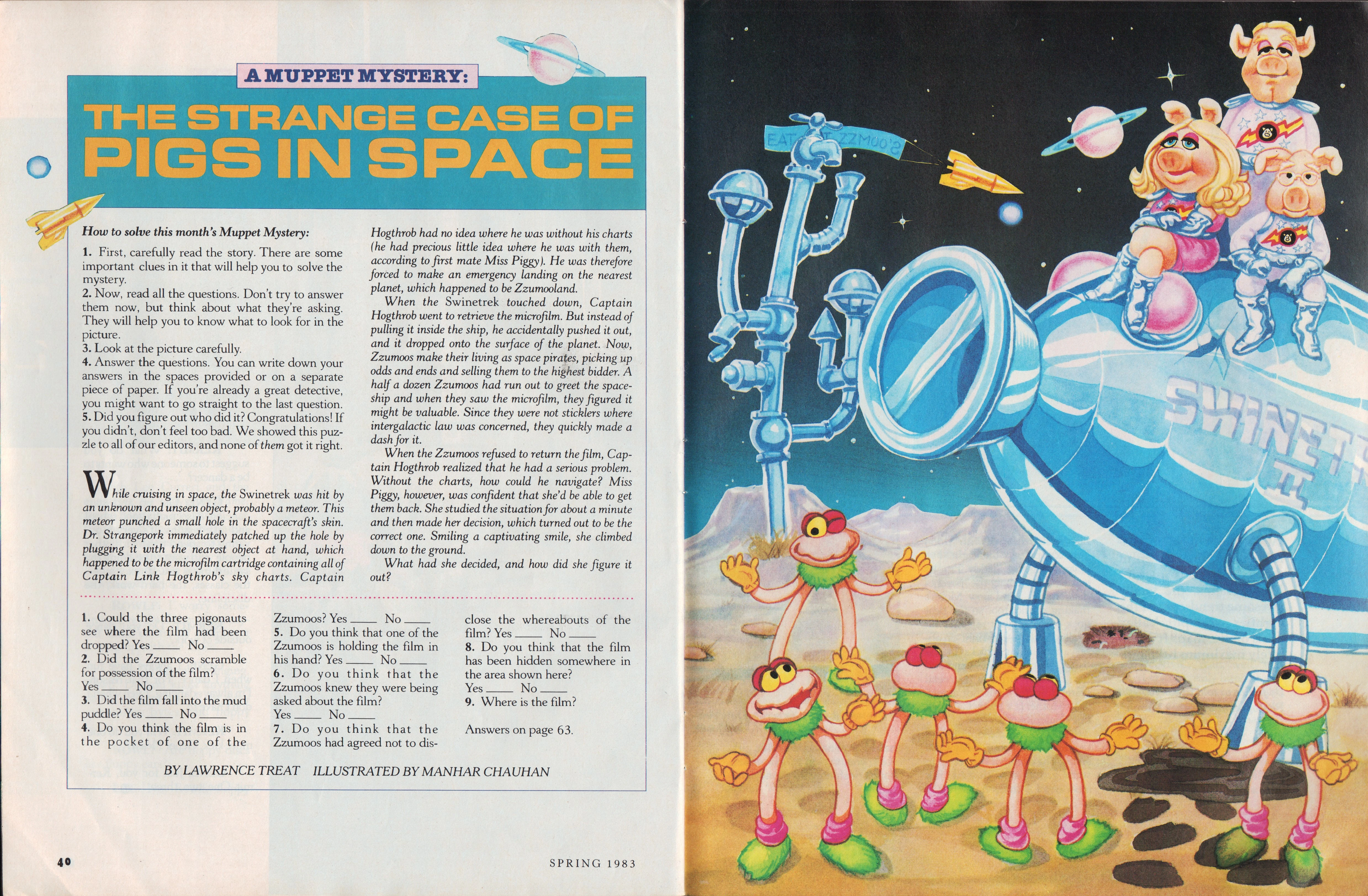 Lawrence Treat (1903-1998) was a mystery novelist known for writing police procedurals. In 1981, he authored Crime and Puzzlement, first in a series combining short mysteries with illustrations showing the clues and a series of yes and no questions about events. Treat used the exact same format for "A Muppet Mystery: The Strange Case of Pigs in Space" in the second issue of Muppet Magazine.