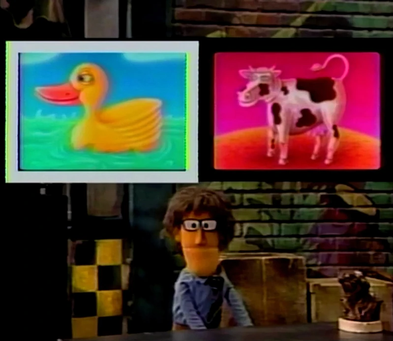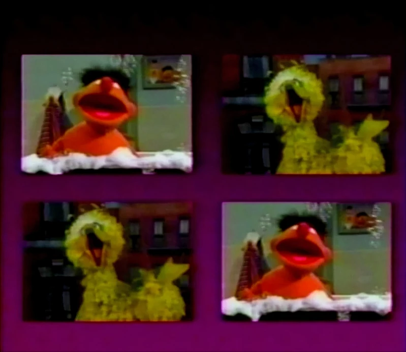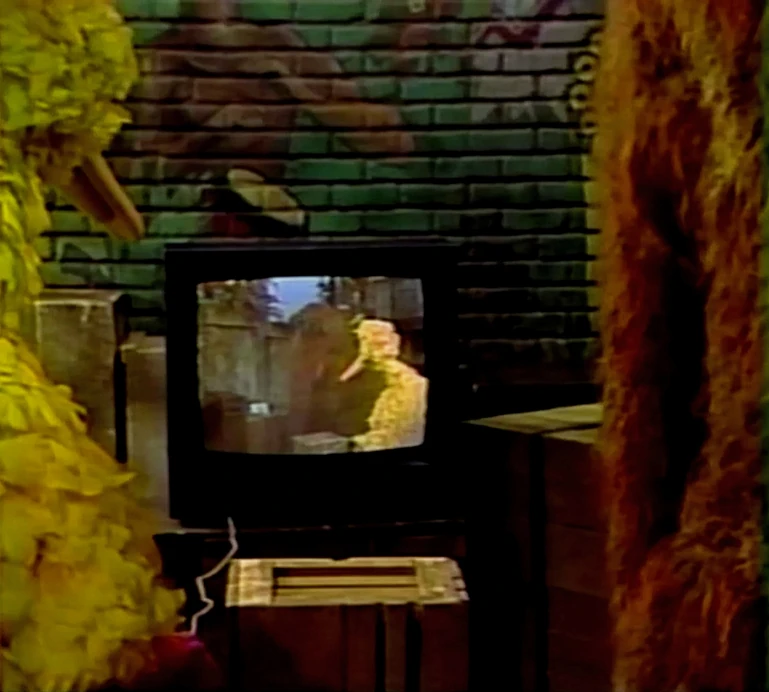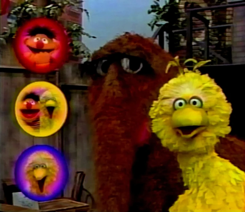 SCENE 2 / Muppets | Big Bird and Ernie are shown singing on the TV (footage from "Singing in the Shower"). Snuffy tells the player to press the red button to hear Ernie sing, the blue button to hear Big Bird sing, and the yellow button to hear them singing together. If no buttons are selected, only Ernie's vocals are heard, as their scenes appear through a split-screen. |