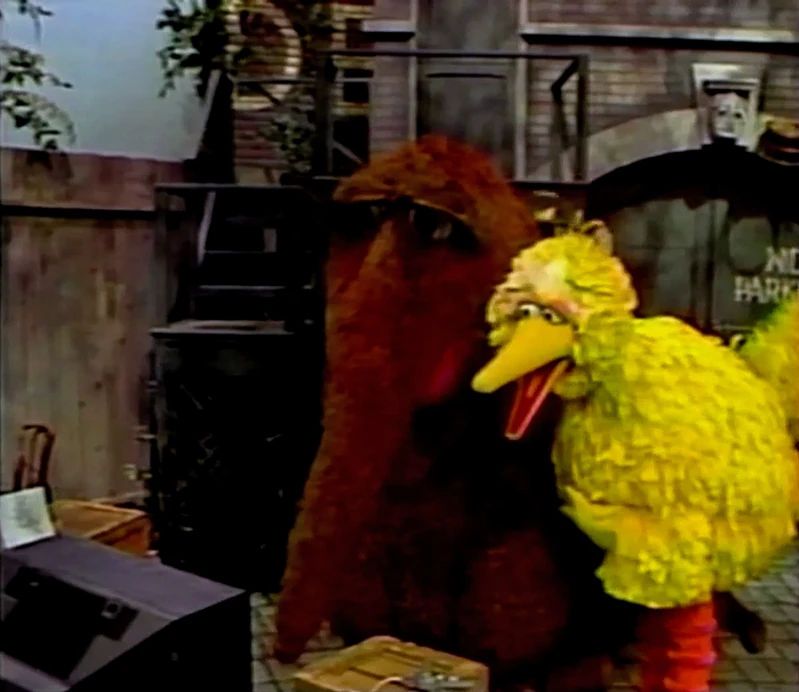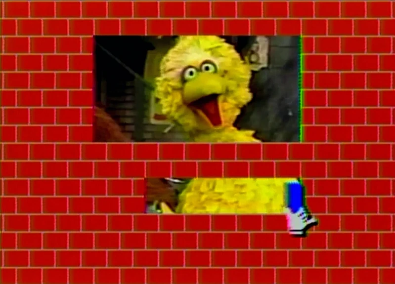 SCENE 1 cont'd | Big Bird and Snuffy observe the controller, which is the same one the player is holding, and they briefly see themselves on the TV. Snuffy reads the manual and instructs Big Bird to wiggle the joystick, and soon, they're covered around a pixelated brick wall. They learn that the player must wiggle the joystick to erase the bricks. They sing a song, "Wiggle the Stick," to encourage the player. If the controller is left idle, Big Bird and Snuffy uncover the screen themselves. |