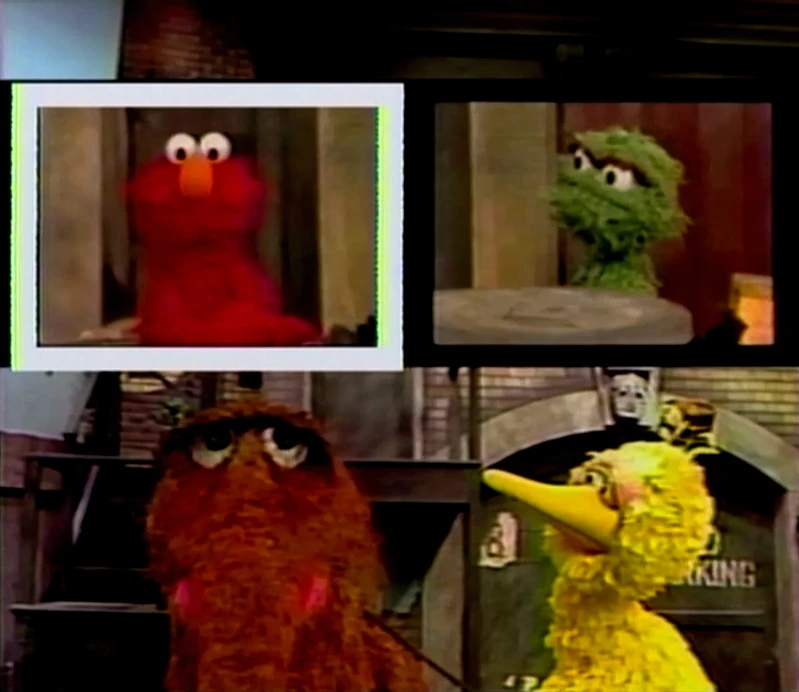 SCENE 3 / Cartoon | Big Bird and Snuffy then see Elmo and Oscar on TV, arguing over who will tell the ape party story. Oscar doesn't want Elmo to tell it because he'll make it sound cute, and Elmo thinks Oscar will make it sound grouchy. The player gets to choose which one of them tells the story, and that character's narration is heard over the "Ape Party" cartoon. (First: Episode 0293) If neither is selected, Elmo's narration plays by default. |