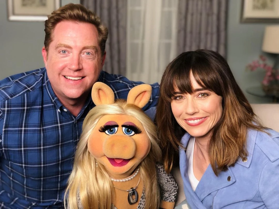 Cardellini with Miss Piggy and producer Kelly Younger on the set of Muppets Now