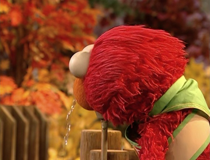 FRAME 5 | Everyone tries to attract the bird by making its trademark call: "Tweet tweet gulp!" Elmo gets thirsty and heads for the water fountain. He takes joy in watching the water go down the drain, until Park Ranger Squirrel appears again. However, they already know he's wasting water and they need to conserve water. They then hear "Tweet tweet gulp!" nearby. But, they find it's only a rabbit who pronounces her Rs like Ws and thinks the water is a "treat." |