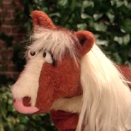 The puppet is a refurbished version of the horse that was made for "Elmo's World: Wild Wild West!"; for this episode, it was altered to look more like an Icelandic horse. It has since retained those features, and has been used in the Elmo the Musical segment "Karate Master the Musical" (performed by Martin P. Robinson), in assorted episodes of The Furchester Hotel (most notably as Carrot the Horse in "Pony in Disguise"), and a season 5 episode of Eine Möhre für Zwei as Tante Hüfli.