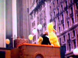 A Sesame Street float first appeared in the parade in 1974,[19] with Muppets and cast members waving to the crowd. The original float featured two buildings -- the 123 Sesame Street brownstone, and Hooper's Store. The streetlight with the Sesame Street street sign was located at the front of the float; a ramshackle fence was at the back, decorated with numbers and letters. Big Bird perched on the roof of the float; Cookie Monster and other Muppet characters stuck their heads out of the windows, and human cast members (including Mr. Hooper, Gordon and Bob) stood on the front of the float.[20] This float appeared in five consecutive parades, through 1978.[21]