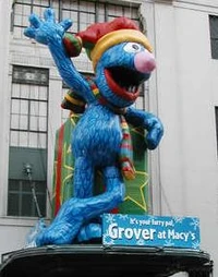In 2004, Grover was Macy's holiday ambassador, so to celebrate that, not only the Super Grover balloon that premiered the year prior now lead the parade, A large Grover balloon sat atop of the main entrance to Macy's. The balloon was a representation of the plush Grover that was available exclusively at Macy's that year, and which was featured in less elaborate window displays (which consisted of displays of the plush Grover).