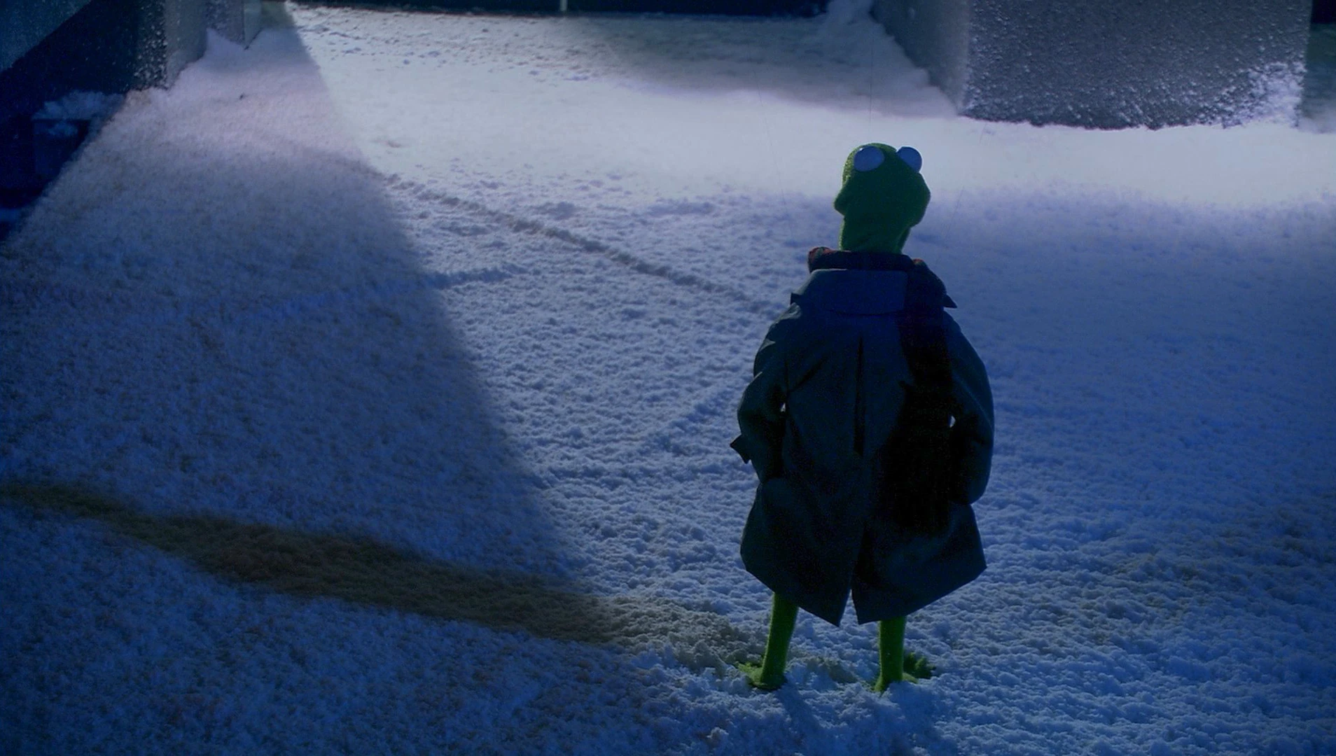 - The shot of Kermit standing in front of the BBAD building is achieved with a marionette. Three thin wires can be seen holding Kermit up, one of which operates the movement of his head.
