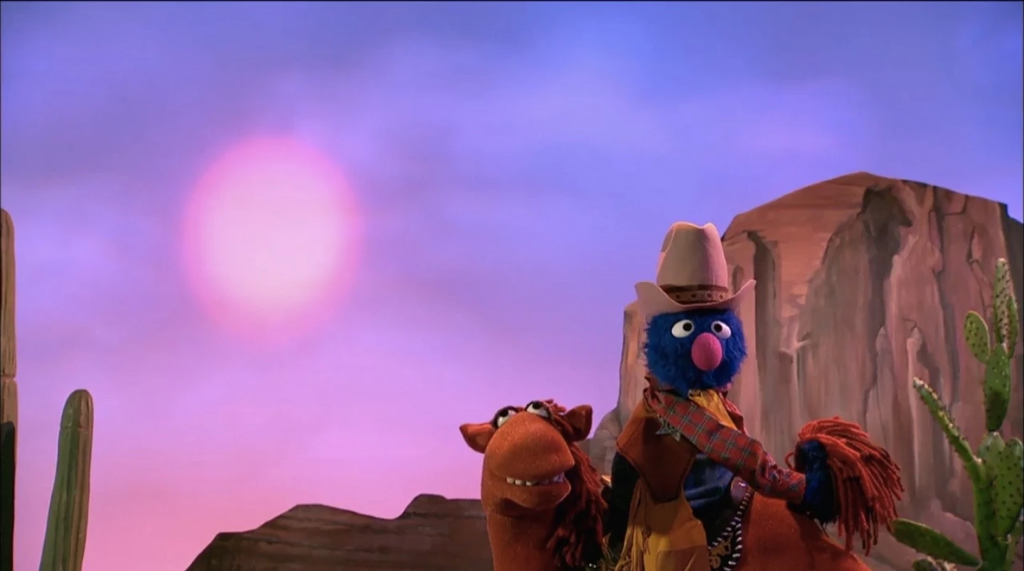 Marshal Grover and Fred the Wonder Horse are riding into the sunset, but Grover faces Fred's back instead. Grover wants to see the sunset as they ride, so he has Fred face the other way. Once Fred starts moving, he begins riding away from the sunset. So, Marshal Grover has Fred walk backwards on their journey.